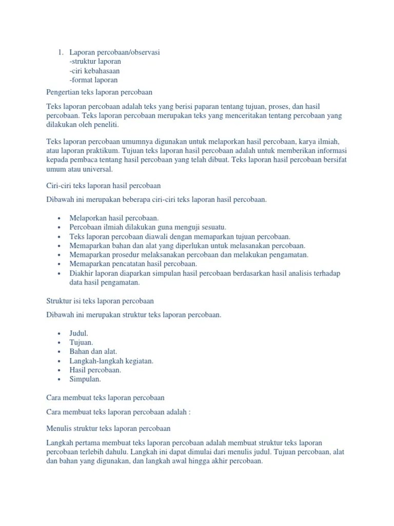 Yuk, belajar cara membuat teks laporan hasil observasi dengan membaca artikel ini! Struktur teks percobaan meliputi judul, tujuan . Membuat judul laporan yang benar sesuai dengan pengamatan yang . Dalam membuat teks laporan percobaan perlu memenuhi struktur dan kaidah kebahasaan yang sesuai. Belajar bahasa melalu bahasa indonesia, pembelajaran bahasa mengerti rasa dalam bahasa kehidupan yang berbahasamengupas tuntas materi .