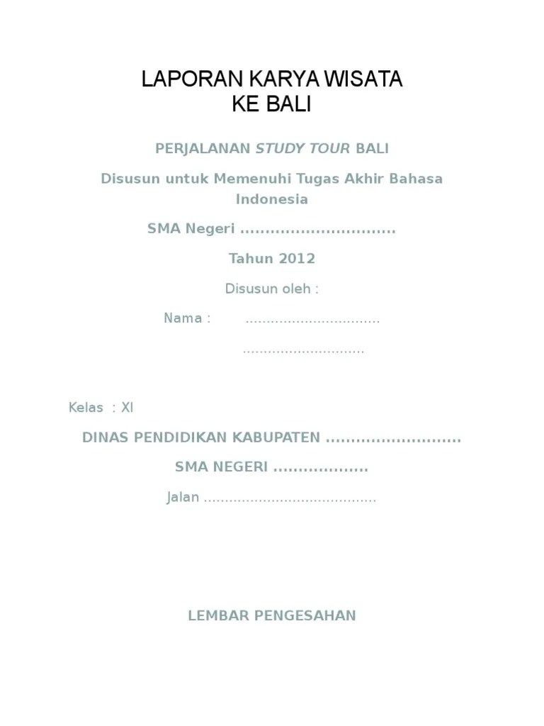 Pembuatan laporan dalam bentuk makalah dengan jumlah halaman halaman diketik dengan spasi 1,5. Laporan study tour de bali study tour ke bali tomy muhlisin ahmad. Sehingga setiap tempat yang diunjungi siswa wajib mencatat informasi yang di dapatkan, karena nantinya laporan ini akan dibuat sebuah karya . Semoga laporan ini dapat menambah pengetahuan dan bermanfaat bagi kita semua. Hasni usaha perjalanan wisata angkatan ke iv sekolah menengah kejuruan negeri 2 simbang maros tahun .